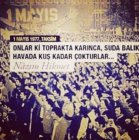 1 Mayıs 1977 Taksim- "O sabah bana ulaşamamış, erken kalkmış, traşını olmuş, bıyıklarını taramış, giymiş parkasını, annesini kardeşini öpmüş, mitinge gitmiş. Bayrağı hep o taşımış. Arkadaşları anlatıyor, en çok onun sesi duyuluyormuşonların tarafta. Hiç şikayet etmemiş. Sırılsıklam terlemiş, gıkı bile çıkmamış. Onu öyle coşkulu hiç görmemişsindir dediler." #Fü #MuratMahmutyazıcıoğlu
